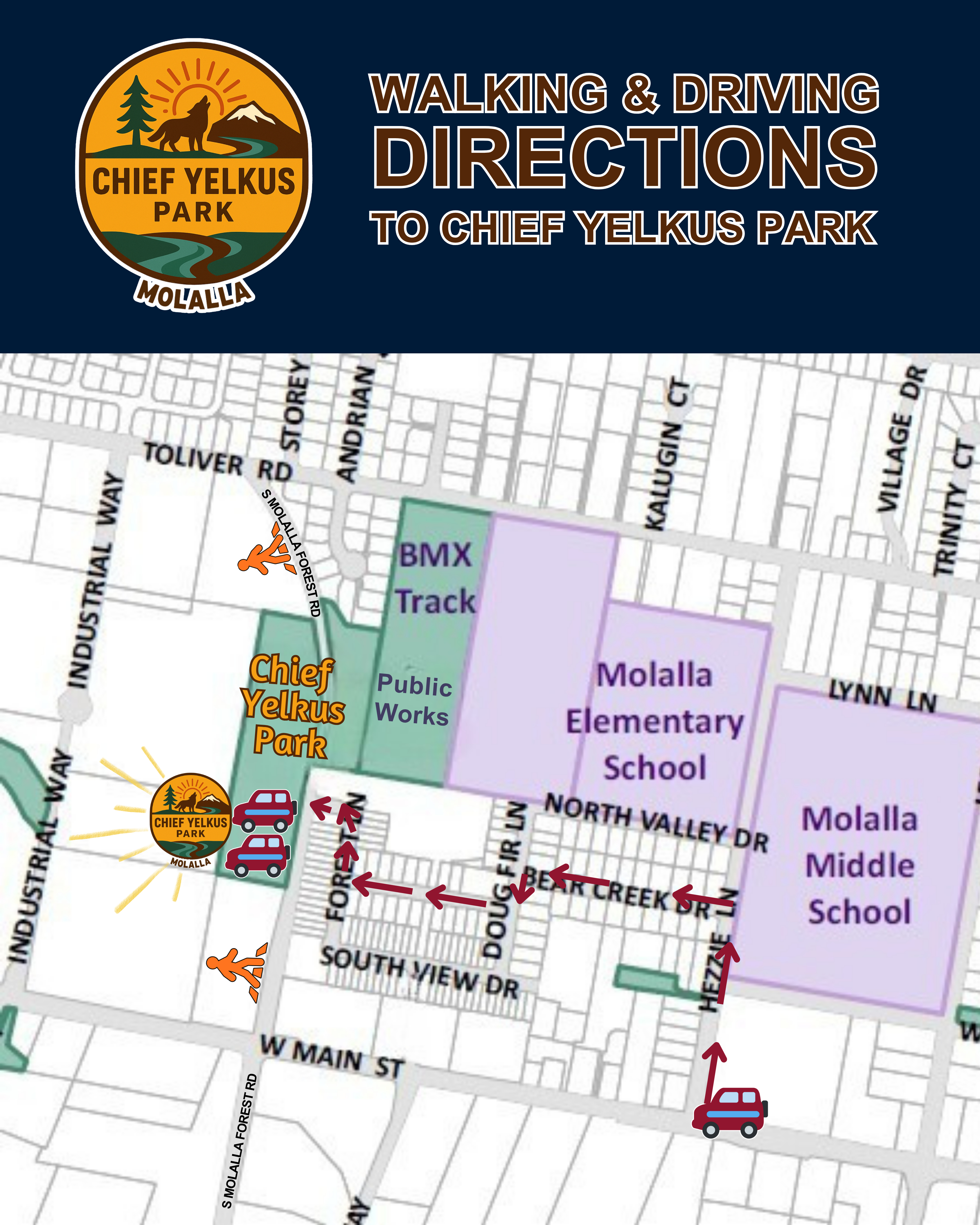 Directions to Chief Yelkus Park, accessible by foot, bicycle, and vehicle.