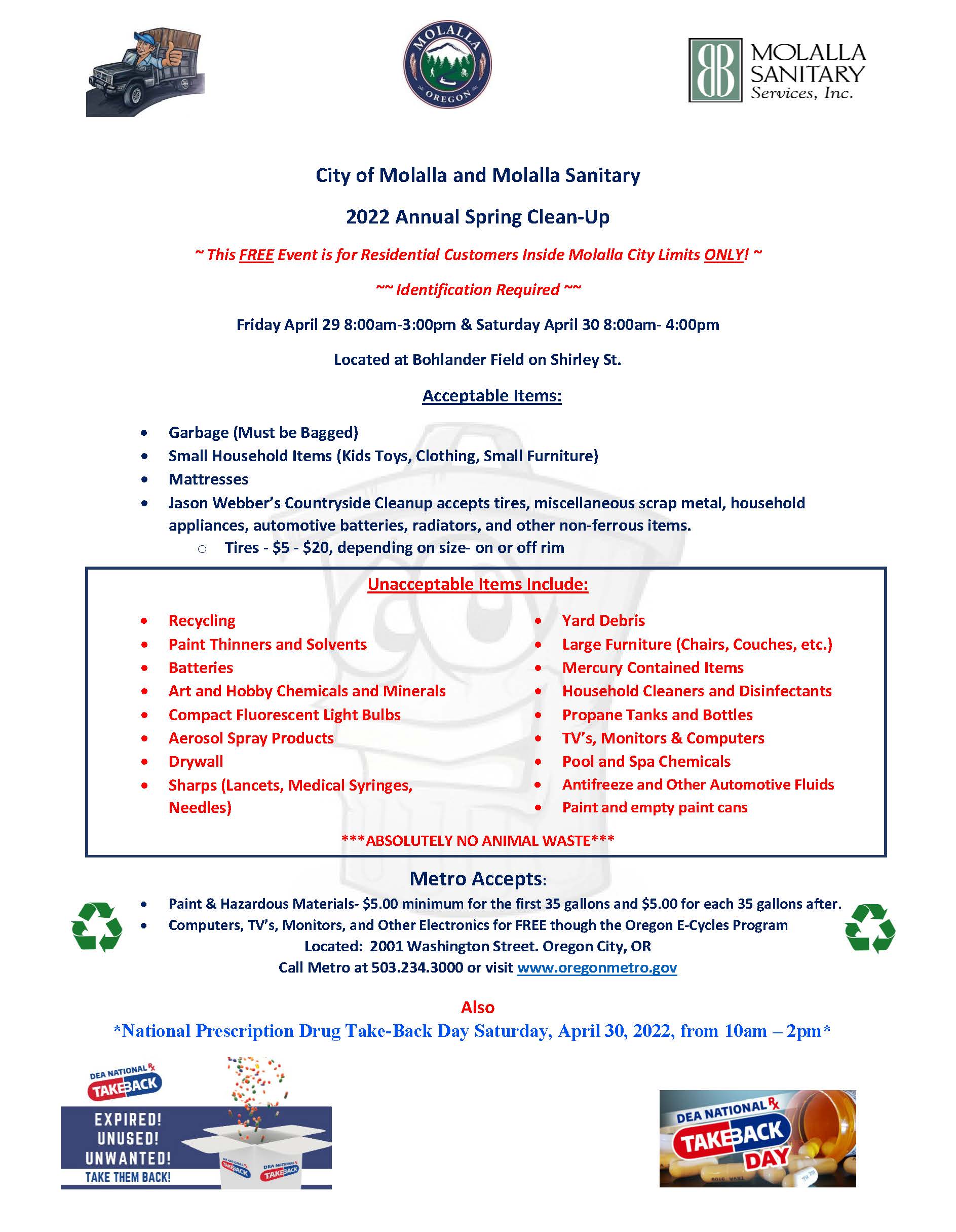 Its time for the City of Molalla and Molalla Sanitary's 2022 Annual Spring Clean-Up event.