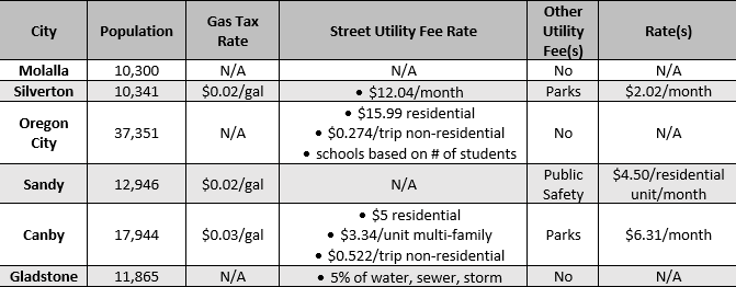 Most cities have a local gas tax, a utility fee, or both. Some cities have utility fees for parks and/or public safety as well. Notably, Molalla does not have a local gas tax or a utility fee of any kind.